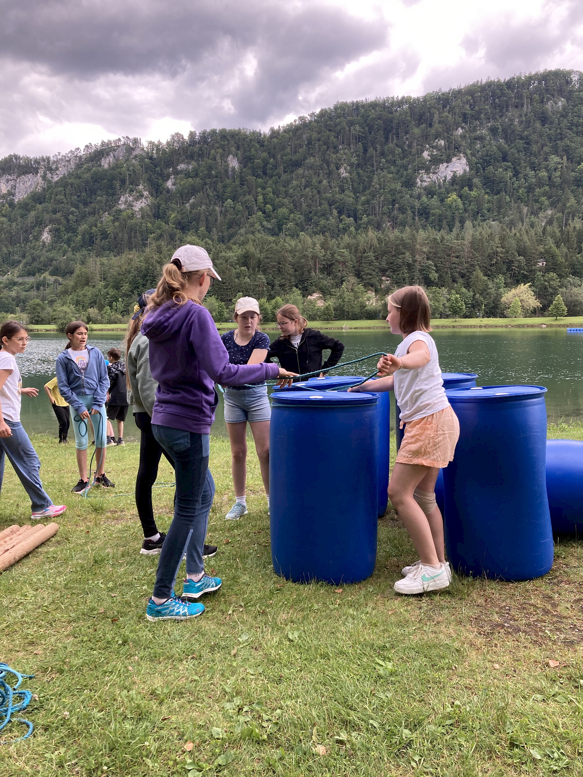 Zum Glück mussten wir unser Gepäck nicht auch noch schleppen, dieses wurde nämlich mit dem Taxi zur Burg gebracht. Wir bezogen unsere Zimmer und nach dem Mittagessen ging es auch schon zum Floßbauen an den Elisabethsee. Leider war uns der Wettergott auch an diesem Tag nicht gewogen, auf Badetemperaturen warteten wir vergebens. Dennoch wurde von allen 3 Gruppen die Aufgabe – ein Floß zu bauen- mit Feuereifer angenommen. Jede Gruppe hatte das gleiche Material zur Verfügung: Seile in unterschiedlicher Länge, Rundhölzer, Bretter und 6 blaue Fässer. Ziel war es, ein fahrtüchtiges Floß zu bauen, das dann auch zu Wasser gelassen werden musste und alle Gruppenmitglieder tragen sollte, ohne zu kentern.