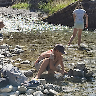 Auf der Wanderung zurück zum Bahnhof genossen alle die Landschaft und es wurden im Schindlbach abgekühlt, „Stoamandl“ und Dämme gebaut – herrlich.
