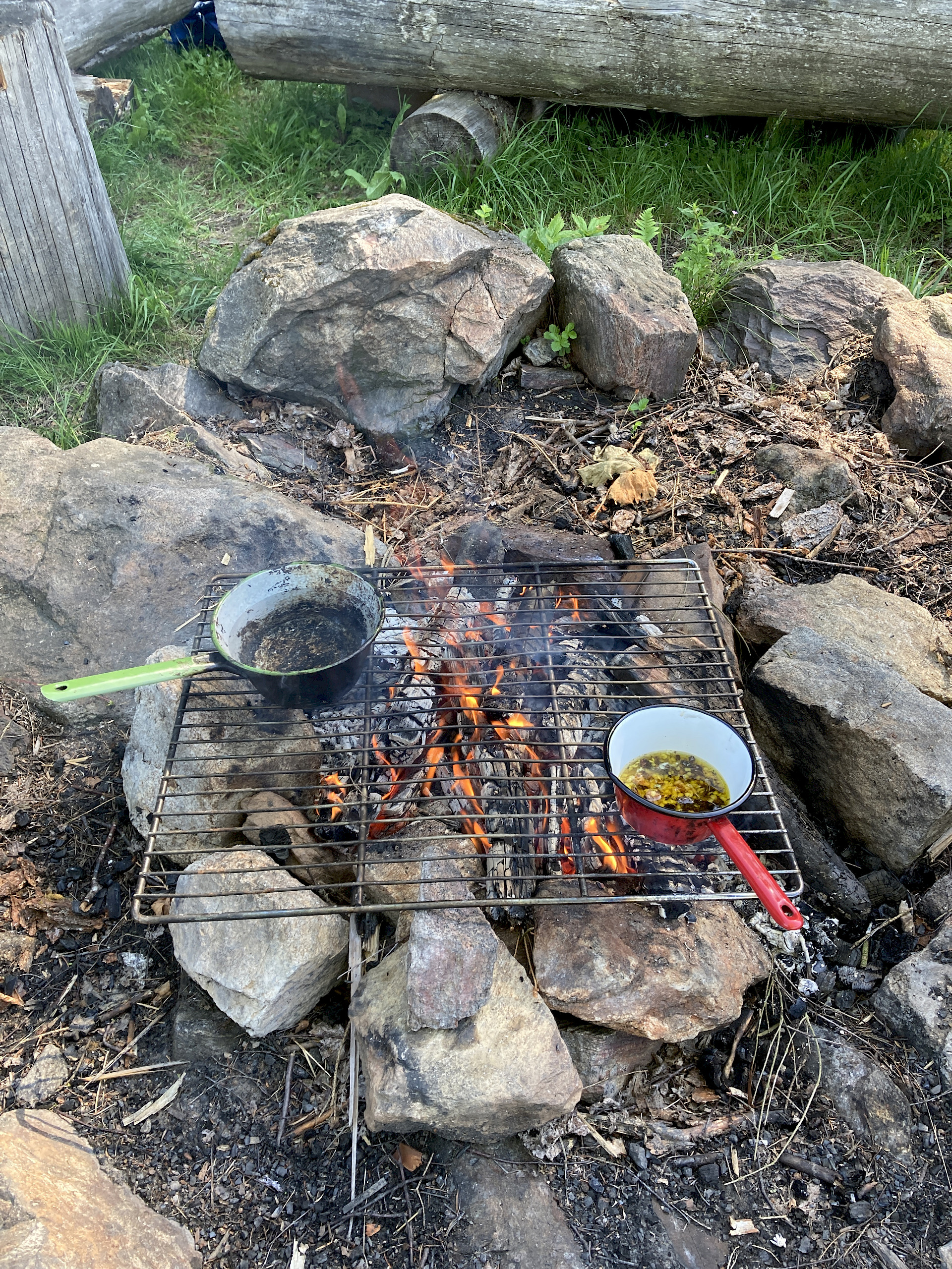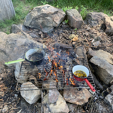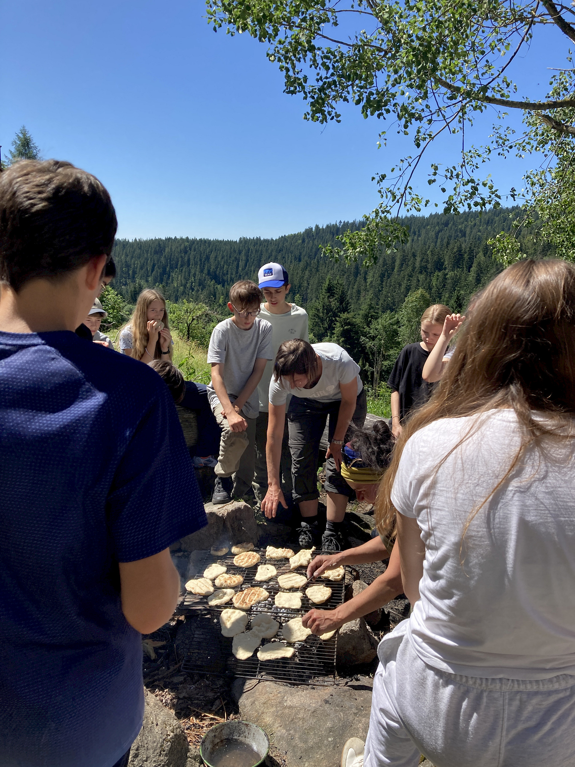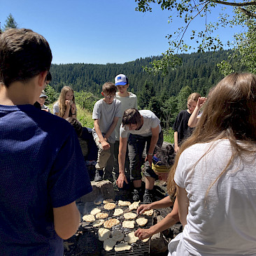 Der zweite Tag begann mit einem kräftigenden Frühstück, denn es wartete ein besonderes Highlight: die Herstellung einer eigenen Pechsalbe. Zuerst sammelten wir Baumharz, das anschließend gereinigt und über einem offenen Feuer geschmolzen wurde. Zusammen mit Bienenwachs und Öl entstand daraus eine wohltuende Salbe, und jede*r durfte ein kleines Döschen als Erinnerung mit nach Hause nehmen. Das offene Feuer nutzten wir danach noch für eine kleine Stärkung: Frische Brotfladen wurden über der Glut gegrillt und mit großem Genuss verspeist. Gestärkt und mit vielen Eindrücken im Gepäck traten wir am 1. Juli gegen Mittag schließlich die Heimreise nach Wels an.
