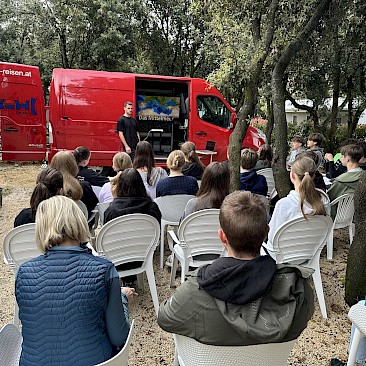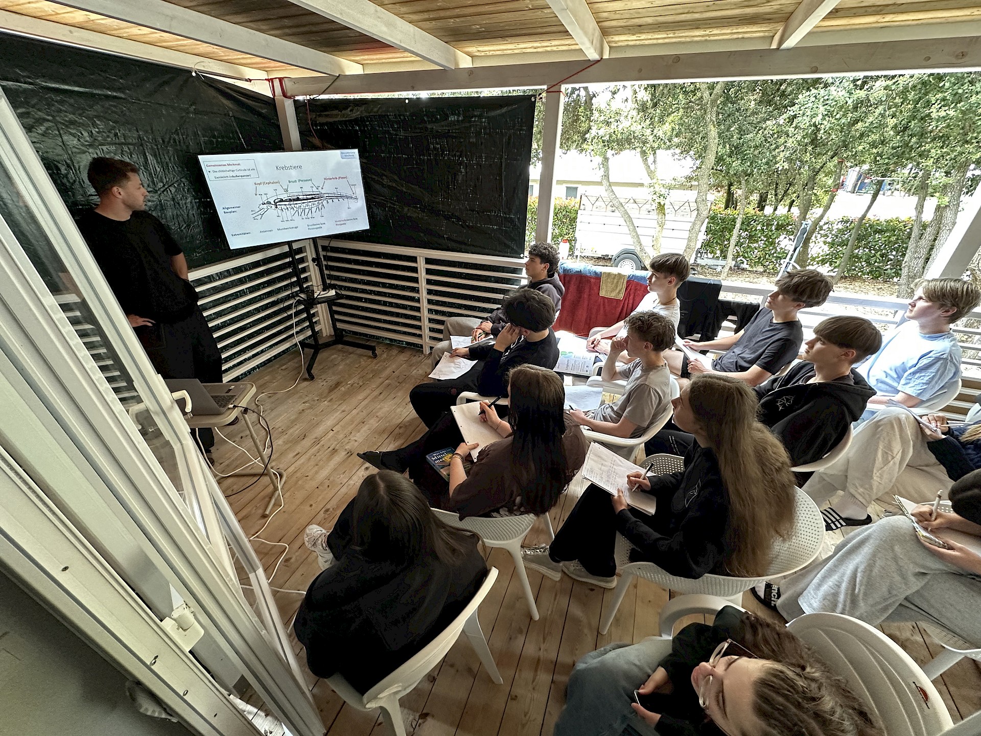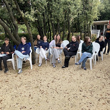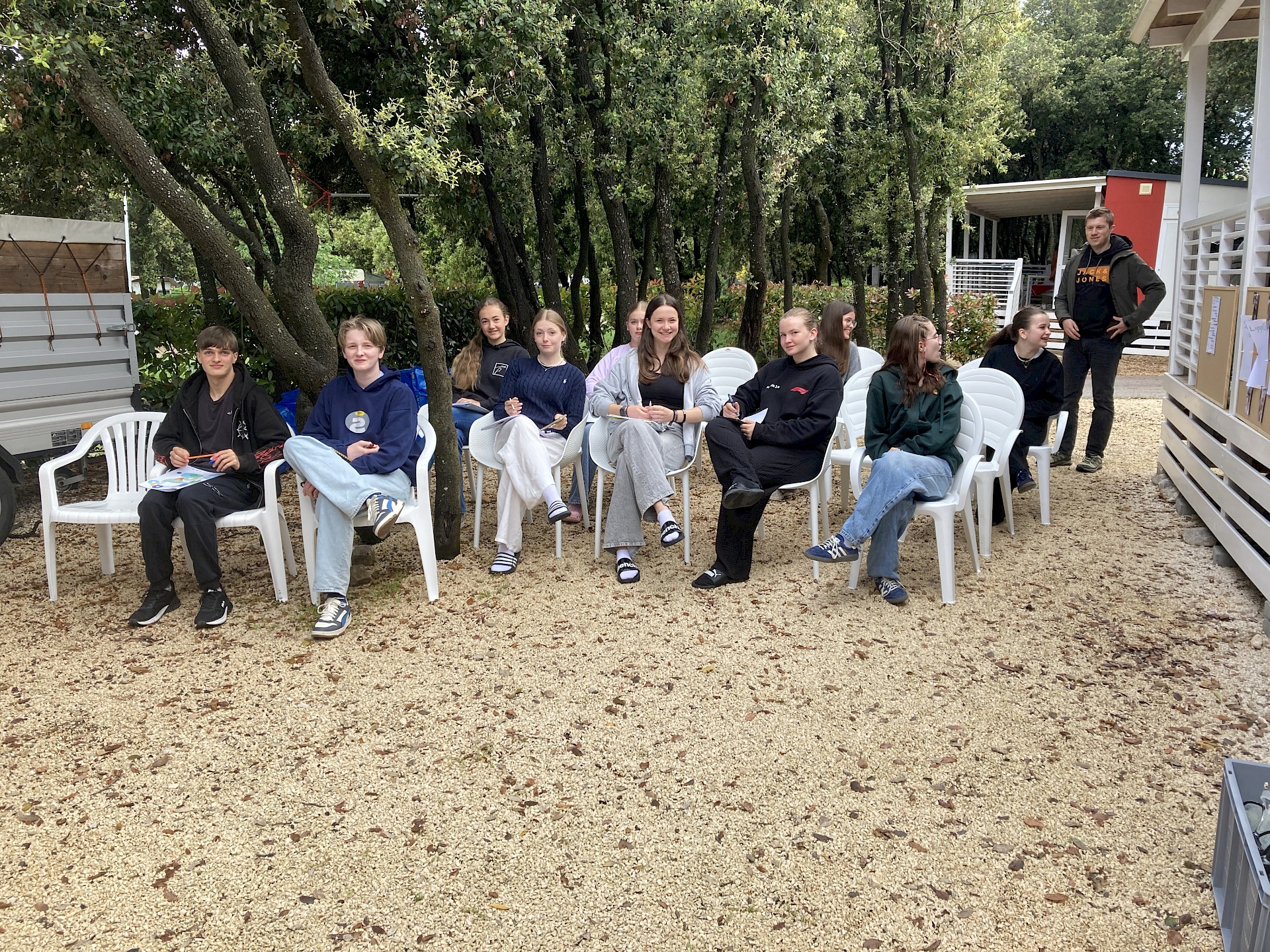 Unser erster Tag der Klassenfahrt begann sehr früh am Morgen. Mit dem Bus machten wir uns auf den Weg nach Kroatien – eine Fahrt von etwa zehn Stunden. Unterwegs legten wir einen spannenden Zwischenstopp in Slowenien ein, um die Höhle von Postojna zu besichtigen. Zuerst fuhren wir mit einem kleinen Zug in die beeindruckende Tropfsteinhöhle hinein. Anschließend erkundeten wir die Höhle zu Fuß, bevor wir mit dem Zug wieder zurückfuhren. Nach der Besichtigung setzten wir unsere Fahrt fort. Auf dem Weg hielten wir noch an, um gemeinsam Lebensmittel für die kommende Woche einzukaufen. Am späten Nachmittag erreichten wir schließlich unseren Campingplatz Monperin. Nach dem Abendessen lernten wir die Leiterinnen und Leiter der meeresbiologischen Woche kennen, die uns das Programm für die nächsten Tage vorstellten. Danach bezogen wir unsere Zimmer und ließen den Tag ruhig ausklingen.