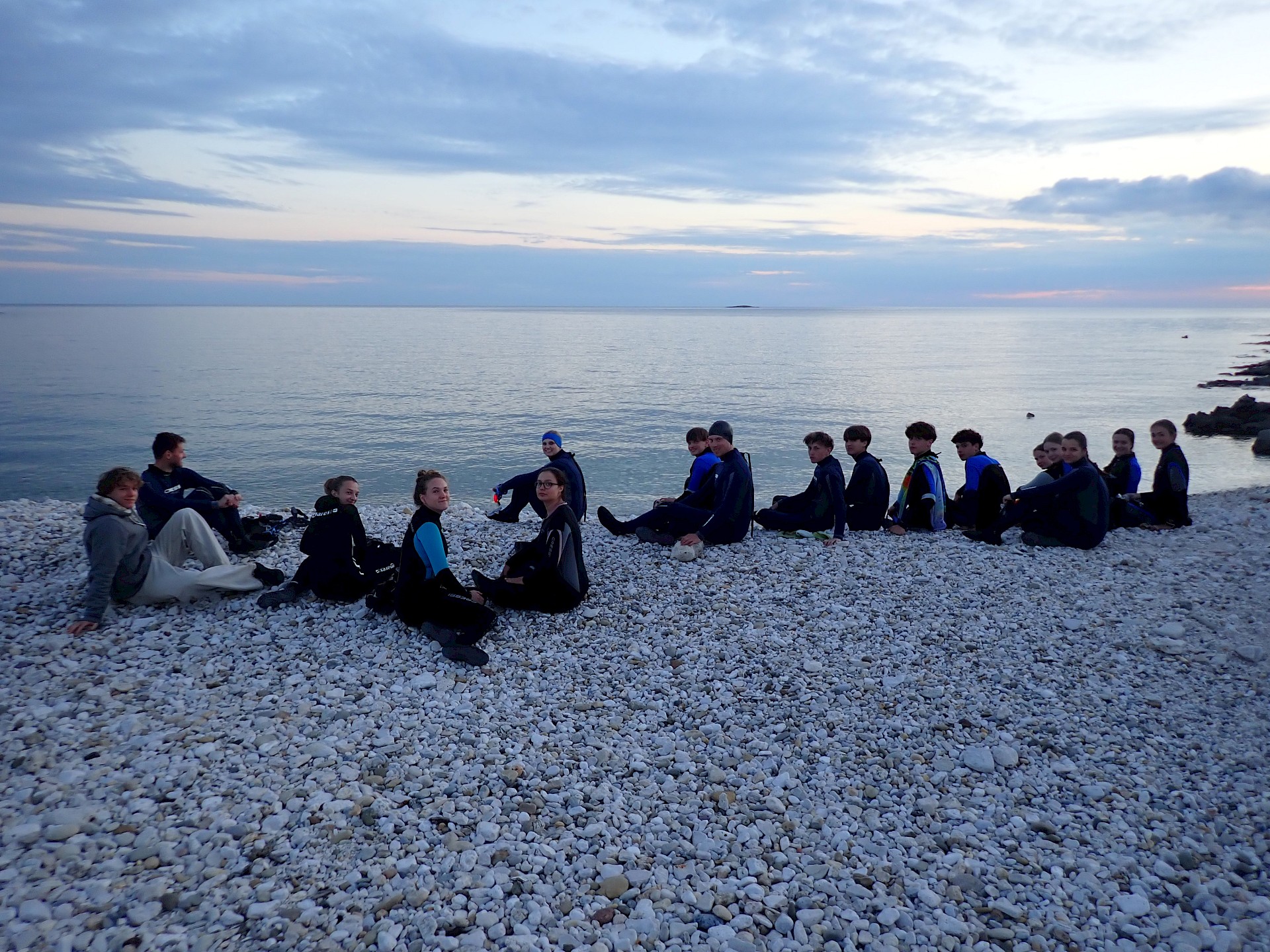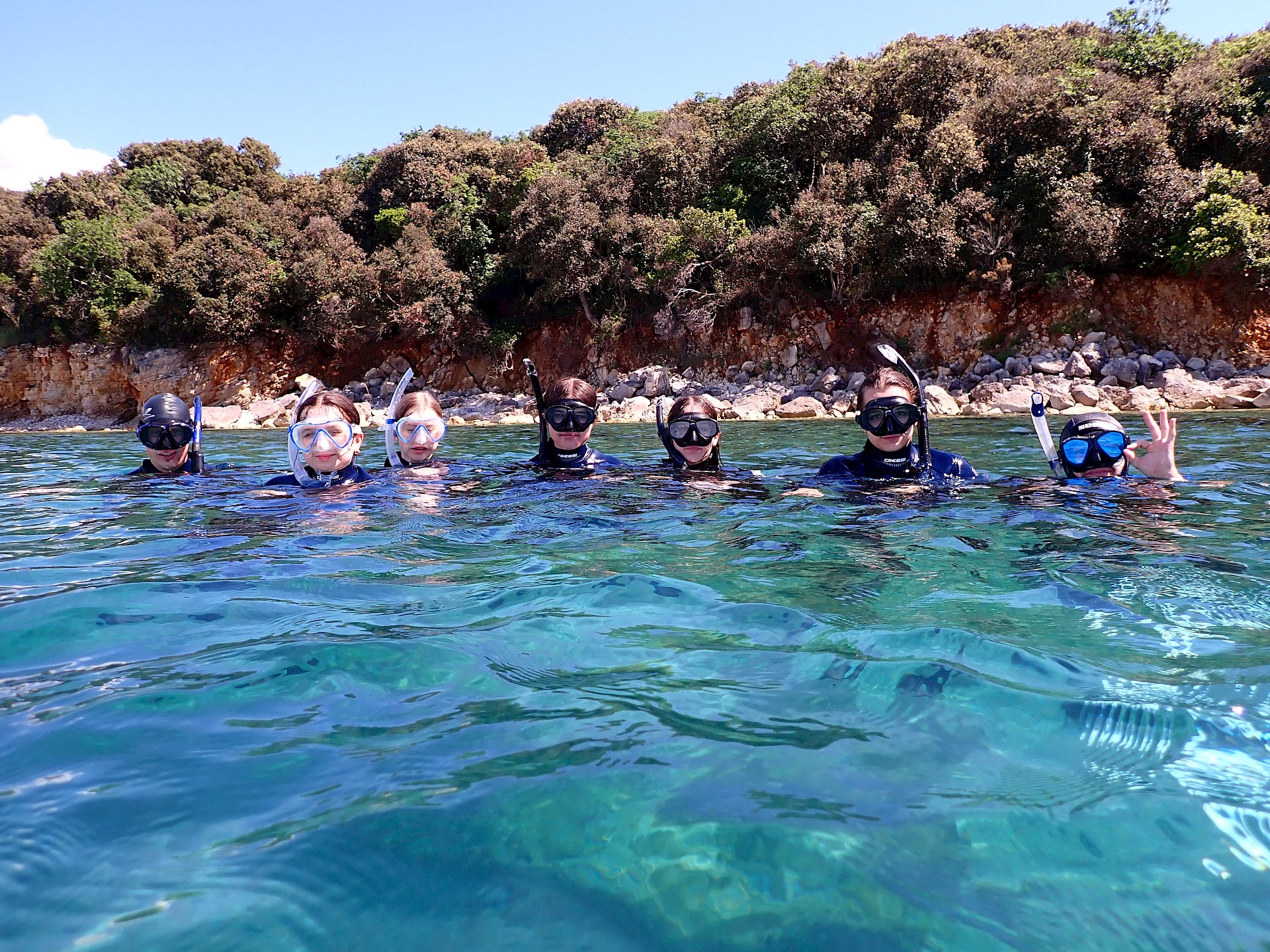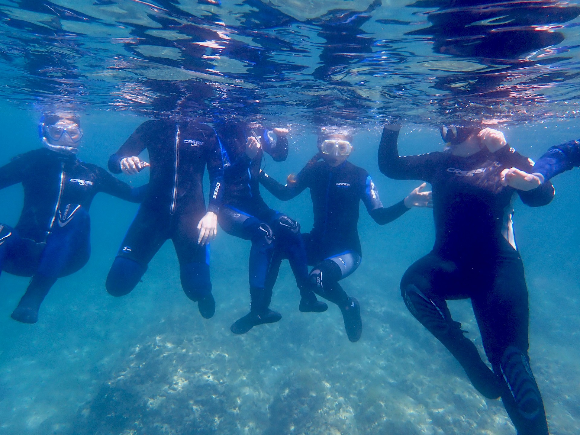 Mit Freitag war leider auch schon der letzte Schnorcheltag gekommen. Wir haben uns um 9:00 Uhr mit Stühlen vor dem Mobilehome der Betreuer getroffen, wo die Gewinner des täglichen Fischlottos ihre Preise bekamen, im Anschluss wurde dann die letzte Runde Fischlotto gespielt. Danach haben wir uns die Fotos angeschaut, die im Laufe der Woche entstanden sind. Zu jedem bekamen wir Informationen, sei es darüber, wie und wann das jeweilige Foto entstanden war, oder zu den Tieren, die man darauf sehen konnte. Frau Professor Stöffler hat in einer Artenliste alles beobachteten Arten auf den Fotos mitnotiert: Wir kennen nun tatsächlich 75 Arten des Mittelmeeres beim Namen und können diese beim Schnorcheln erkennen. Eigentlich unglaublich, wie schnell man im Mittelmeer Artenkenntnis aufbauen kann. Als wir damit fertig waren, zogen wir alle unsere Neoprenanzüge an und machten uns auf den Weg zu unserem vorletzten Schnorchelausflug. Während diesem haben wir wieder die verschiedensten Lebensräume und -formen gesehen. Danach hatten wir den ganzen Nachmittag bis zum Abendessen um 18:30 Uhr Freizeit, in der wir die Mobilehomes bereits weitgehend zusammenräumen mussten. Zum Abschluss gingen wir noch mit Taschenlampen ausgestattet Nachtschnorcheln, was für alle ein ganz besonderes Erlebnis war. Wir sahen einen Oktopus und schlafende Fische, eine Sepia und bemerkten, dass die Unterwasserwelt in der Nacht auch voller Leben ist!