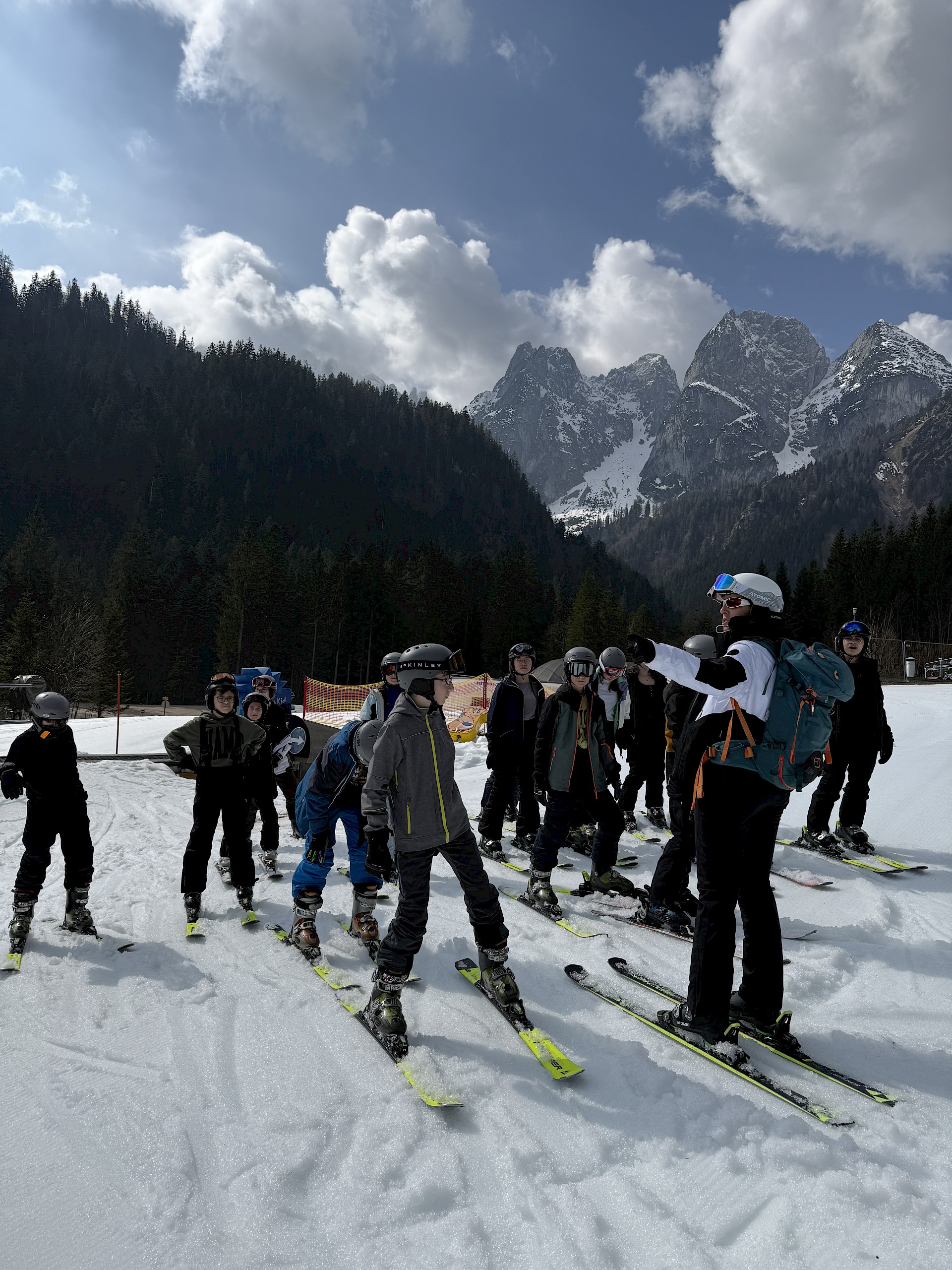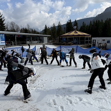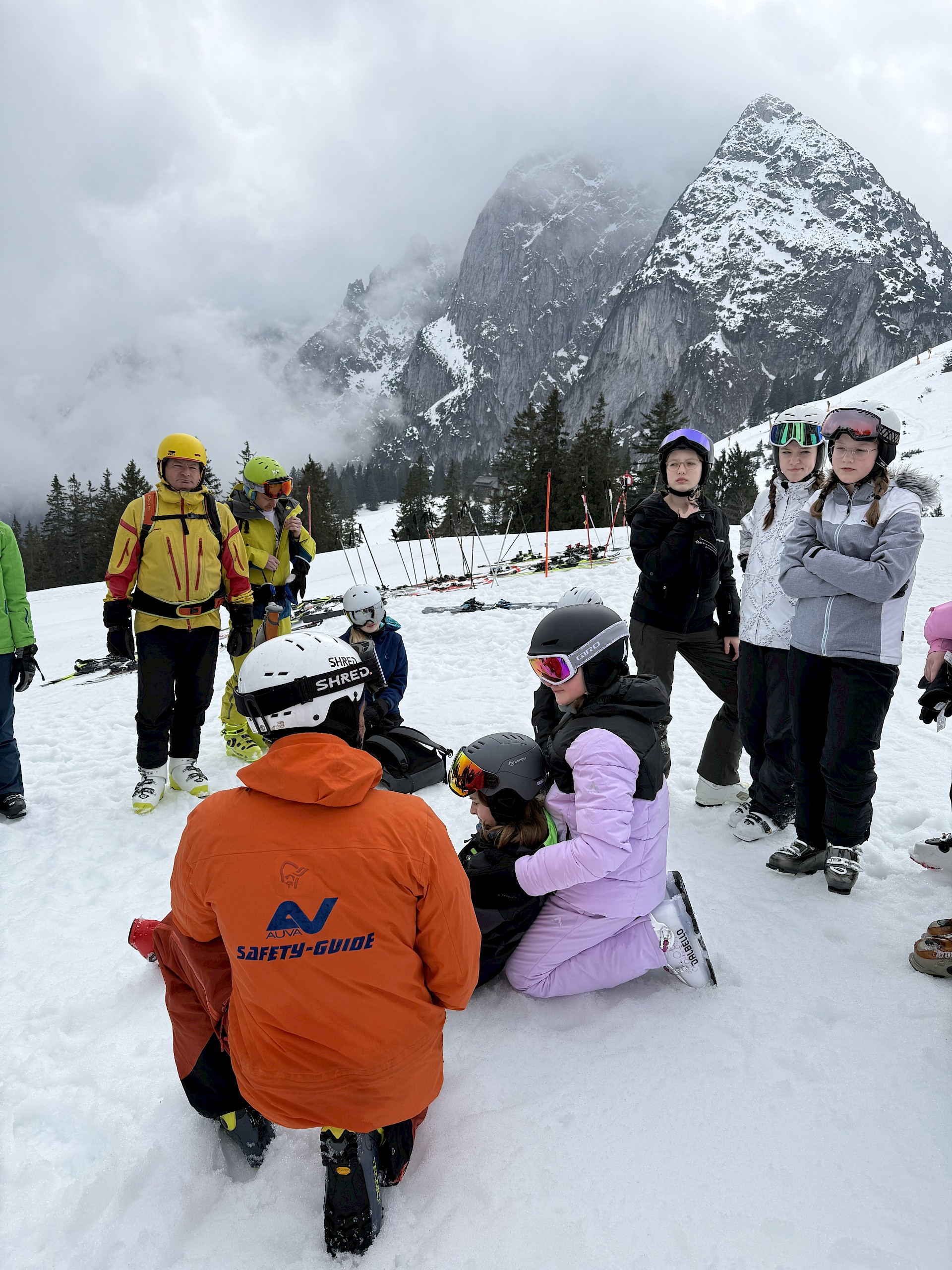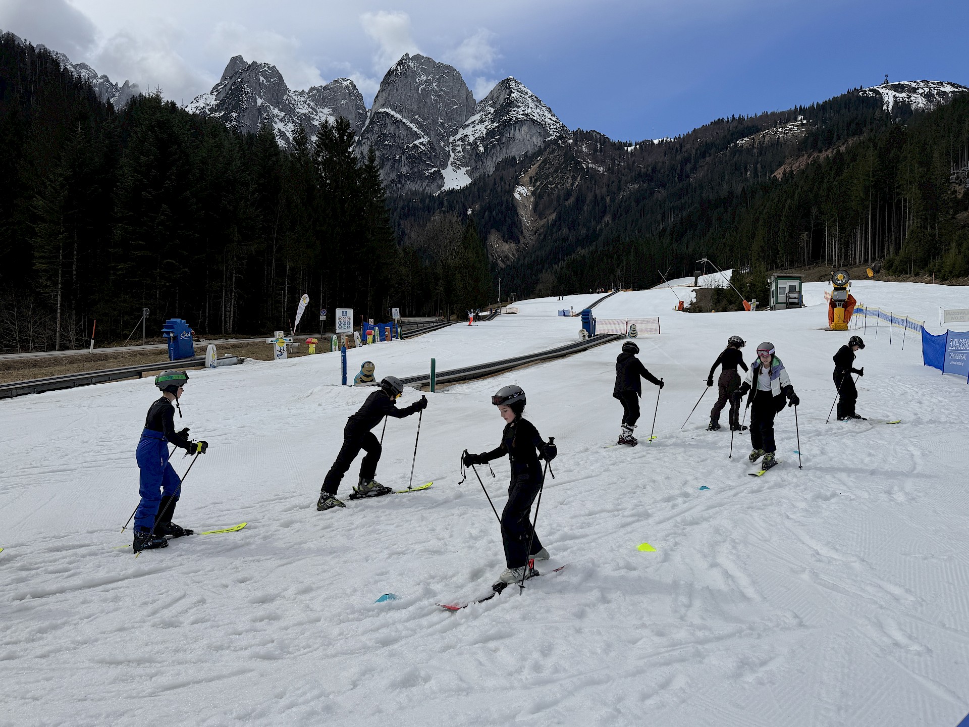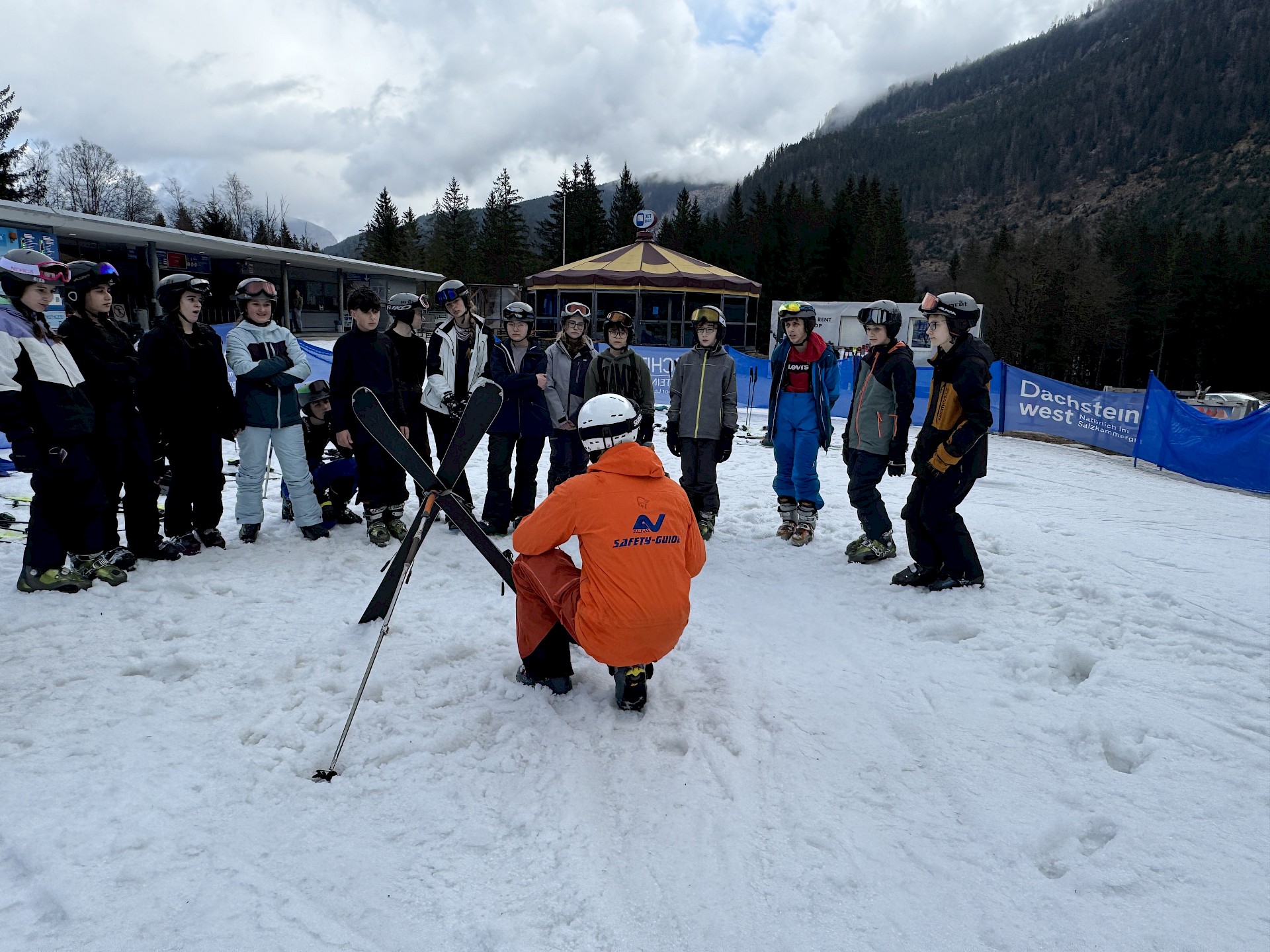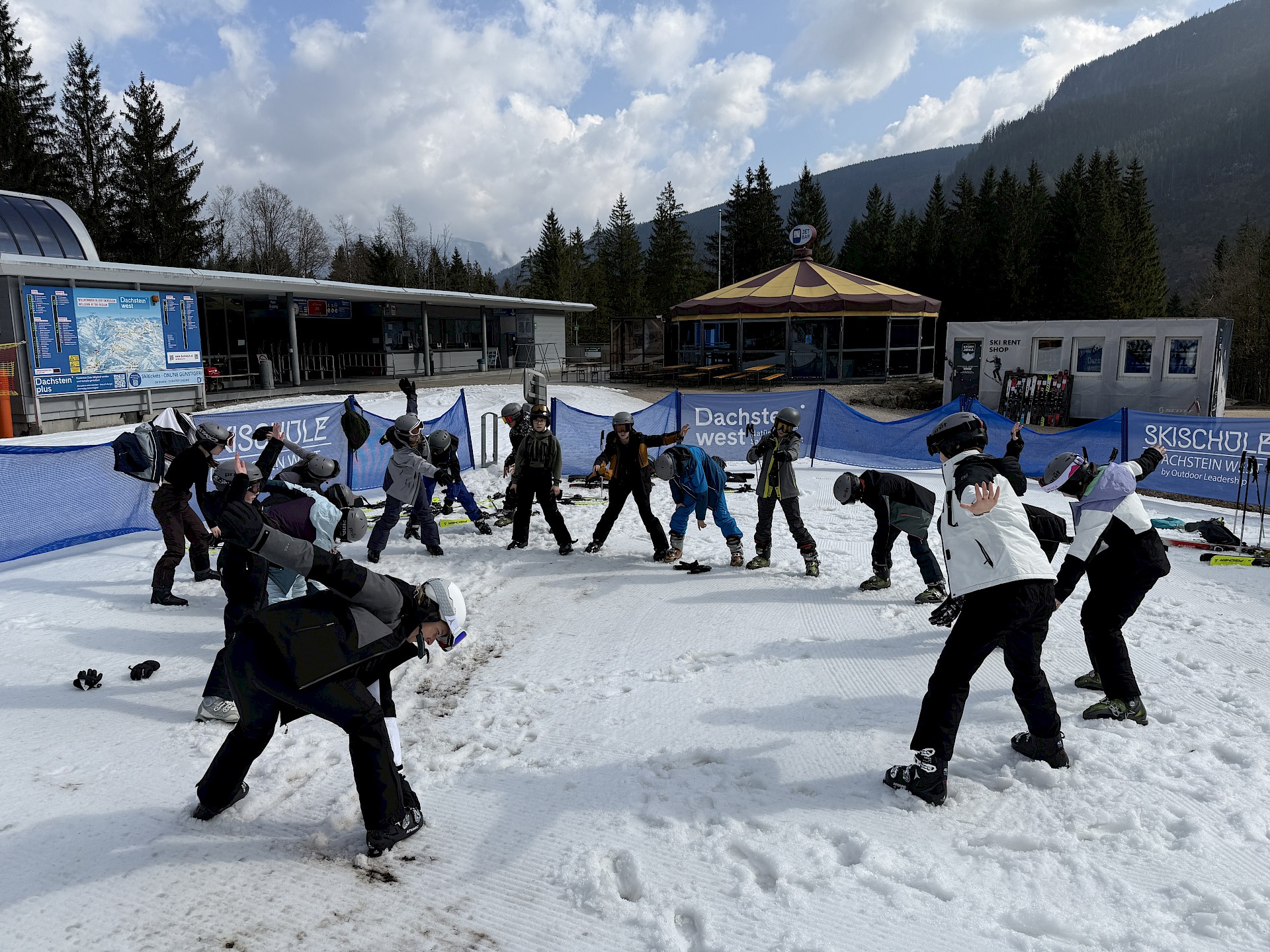 In den Skigebieten Dachstein West und Krippenstein lernten die Anfänger*innen das Skifahren, aber auch die Fortgeschrittenen verbesserten ihre Fähigkeiten auf den Skiern und versuchten sich an ihren ersten Carvingschwüngen. Neben dem Skifahren erfuhren wir in Kooperation mit der AUVA, wie man bei einem Unfall auf der Piste richtig reagiert und die Rettungskette in Gang setzt.