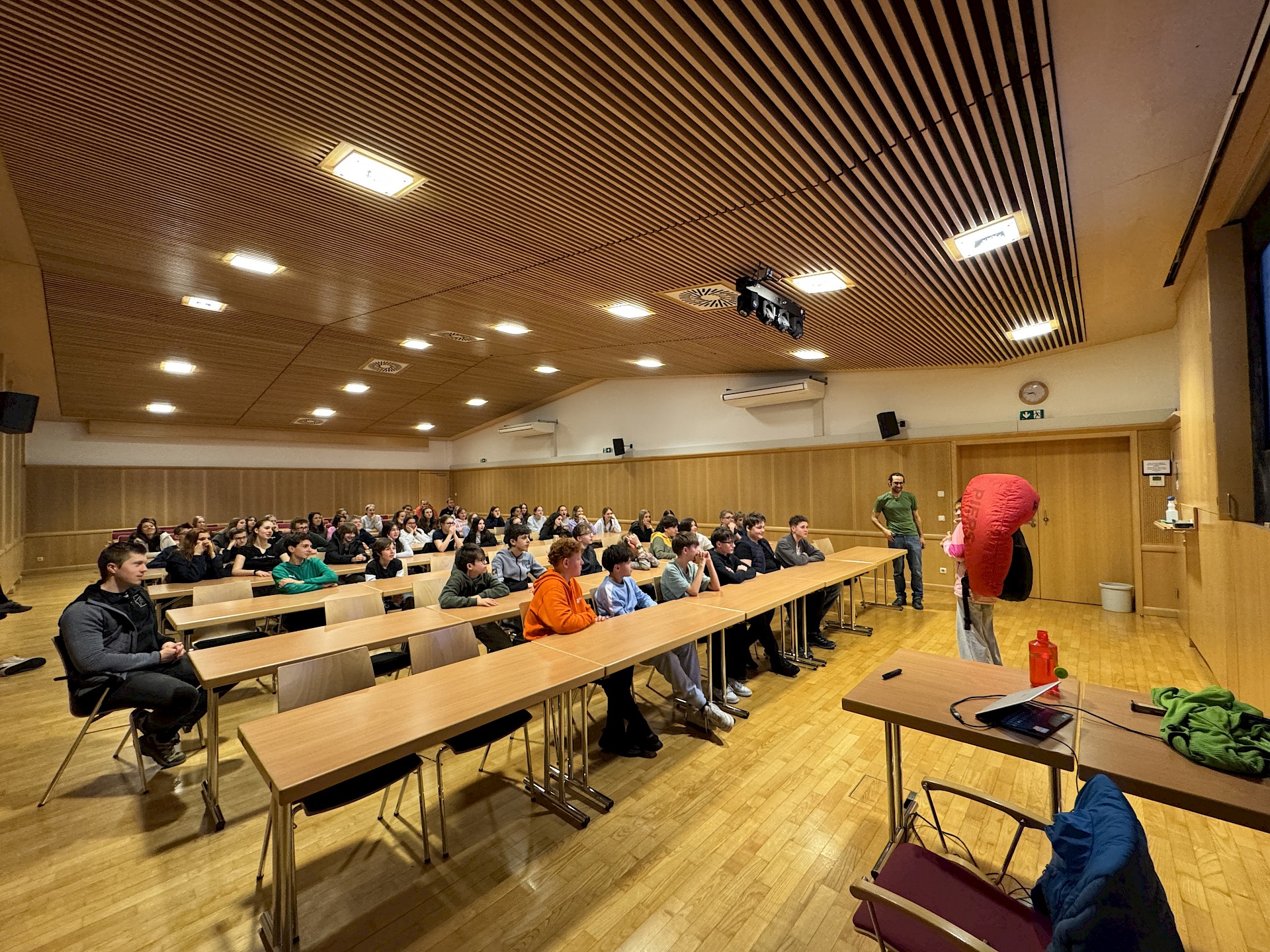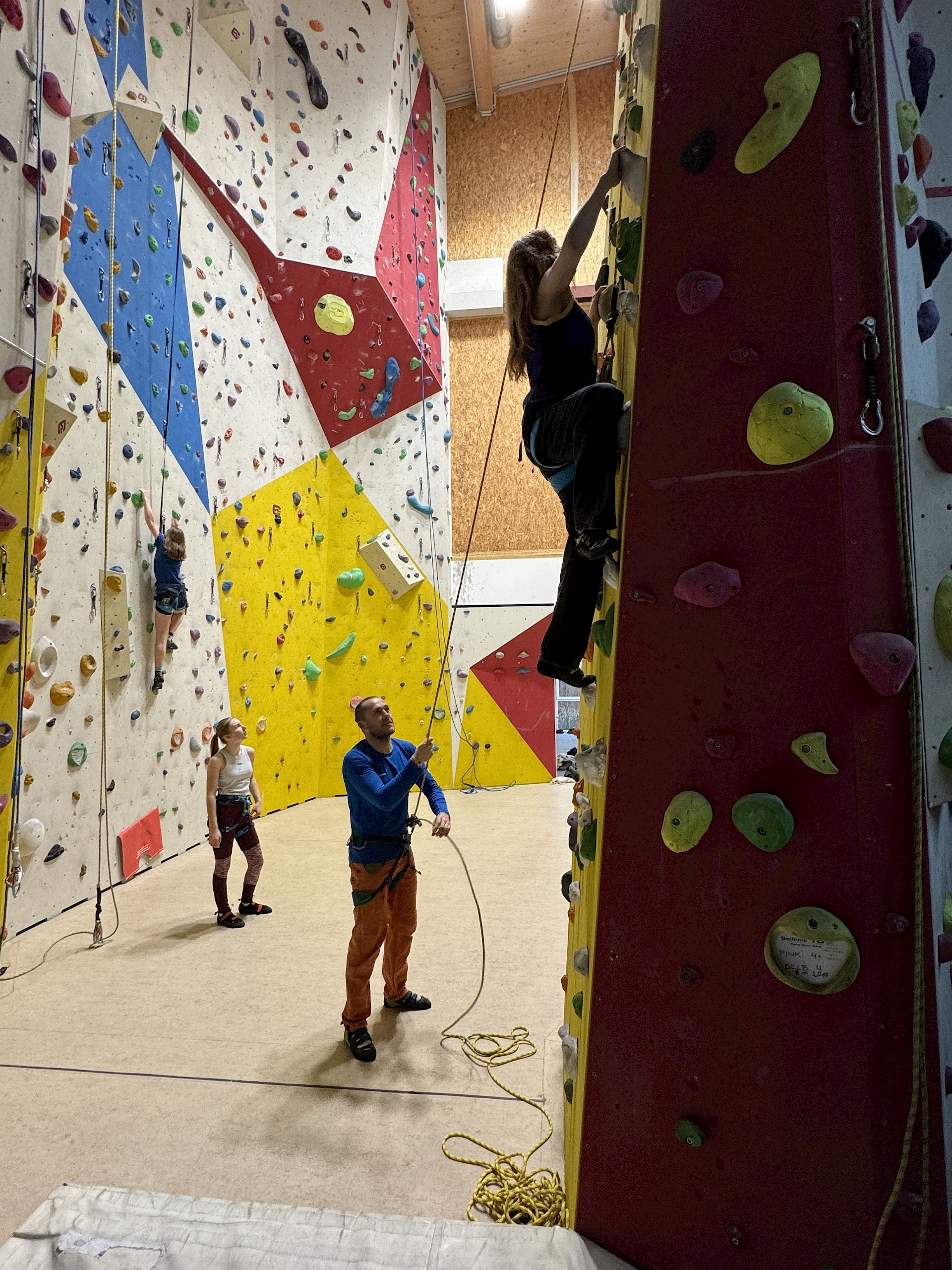 Untergebracht im BSFZ Obertraun blieb kein (Sportler-)Wunsch unerfüllt. Wir nutzten abends die Dreifachturnhalle mit Riesentrampolin, Badmintonfeldern und Ballspielen, konnten uns aber auch in der Kletterhalle und auf dem Fußballfeld im Freien austoben. Im großen Seminarraum erzählte uns Achim von der AUVA Interessantes über Sicherheit beim Wintersport und am letzten Abend gestalteten wir den Raum zu einer Disco um.