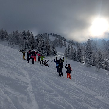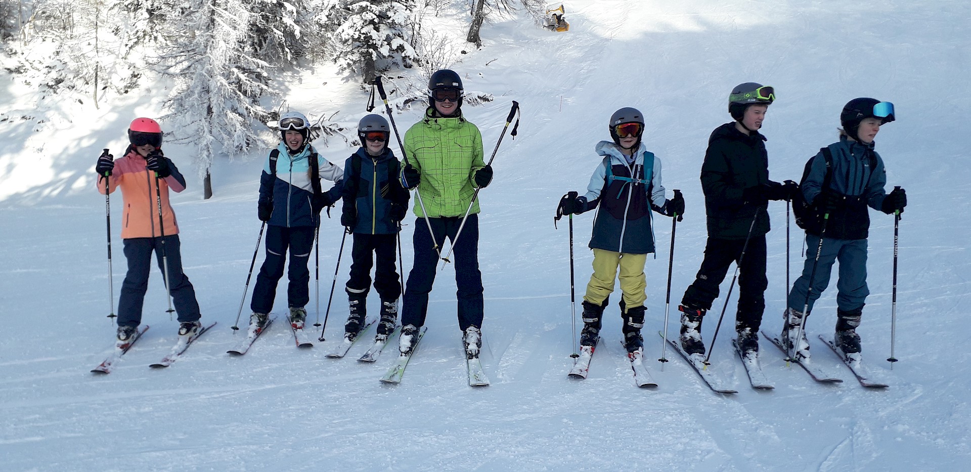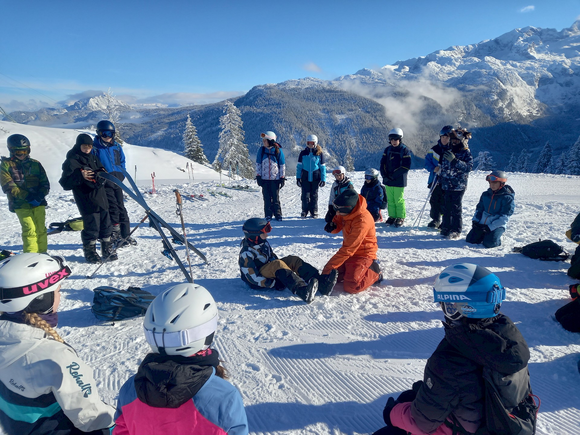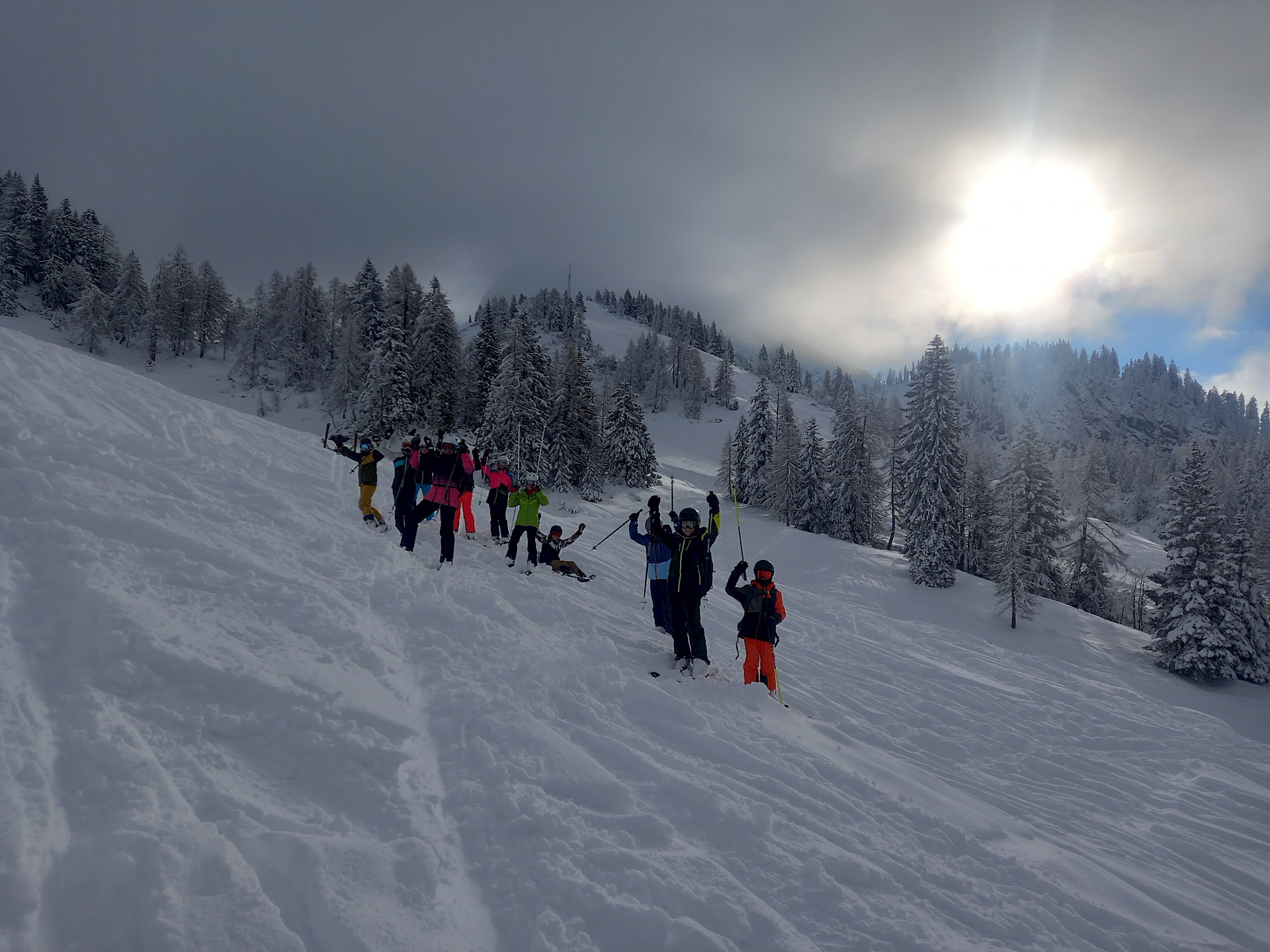 Am folgenden Tag führte uns der Vortragende einfache Rettungsmaßnahmen direkt im Gelände vor. Im Laufe der Woche konnten wir zusätzlich zum Skifahren den Turnsaal, die Kletterhalle und den Tischtennisraum sportlich nutzen. Zu Mittag kehrten wir in verschiedenen Hütten ein, und tauschten unsere Essensmarken gegen typische Schmankerl wie Kaiserschmarrn, Germknödel, Gulasch usw. ein. Die gewonnene Energie nützten wir für rasante Fahrten im Tiefschnee. Nicht nur alle Schüler*innen purzelten das eine oder andere Mal durch den Schnee, sondern auch so manche Professor*innen. Schnell war die Skiwoche vorbei. In den letzten beiden Tagen konnten die Anfänger*innen ihr gewonnenes Können auf den roten Pisten unter Beweis stellen. Den letzten Abend beendeten wir traditionellerweise mit einer Disco. So richtig in Schwung kam die Party jedoch erst, als die Professorinnen ihre Tanzkünste unter Beweis stellten.