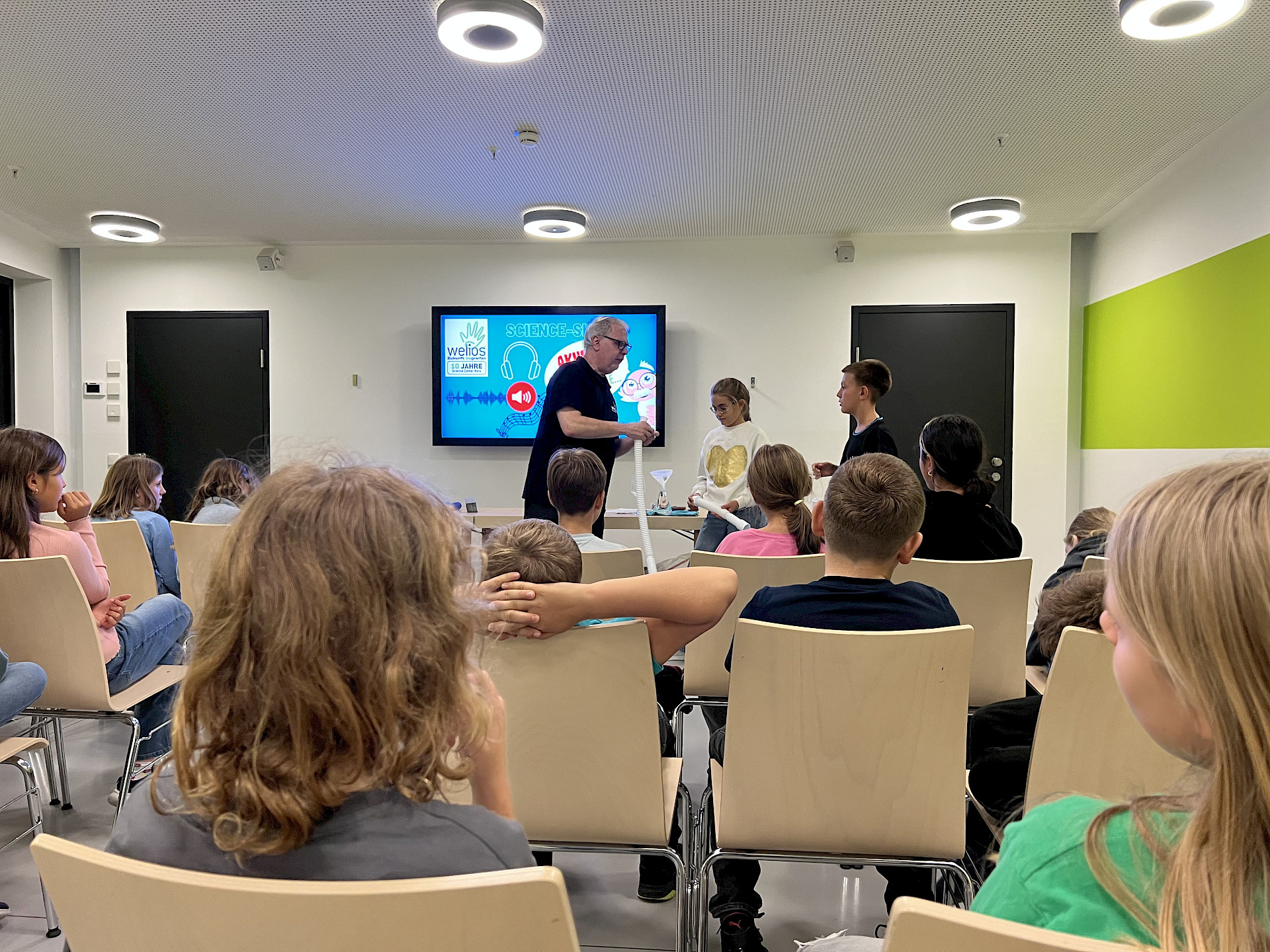 Am 25.9.25 erlebte die 1D zusammen mit Prof. Emminger, Prof. Keintzel (KV) und unterstützt durch zwei Mütter einen abwechslungsreichen Vormittag im Welios Wels. Ausgerüstet mit Regenschirm und Regenjacke marschierten wir zum Museum, dort angekommen konnte, aufgeteilt in Kleingruppen, das Haus erkundet und nach Herzenslust ausprobiert werden. Den krönenden Abschluss bildete eine Akustik-Show, in der mit verschiedenen Hilfsmitteln veranschaulicht wurde, wie Töne erzeugt werden, wie sich Schall ausbreitet und vieles mehr.