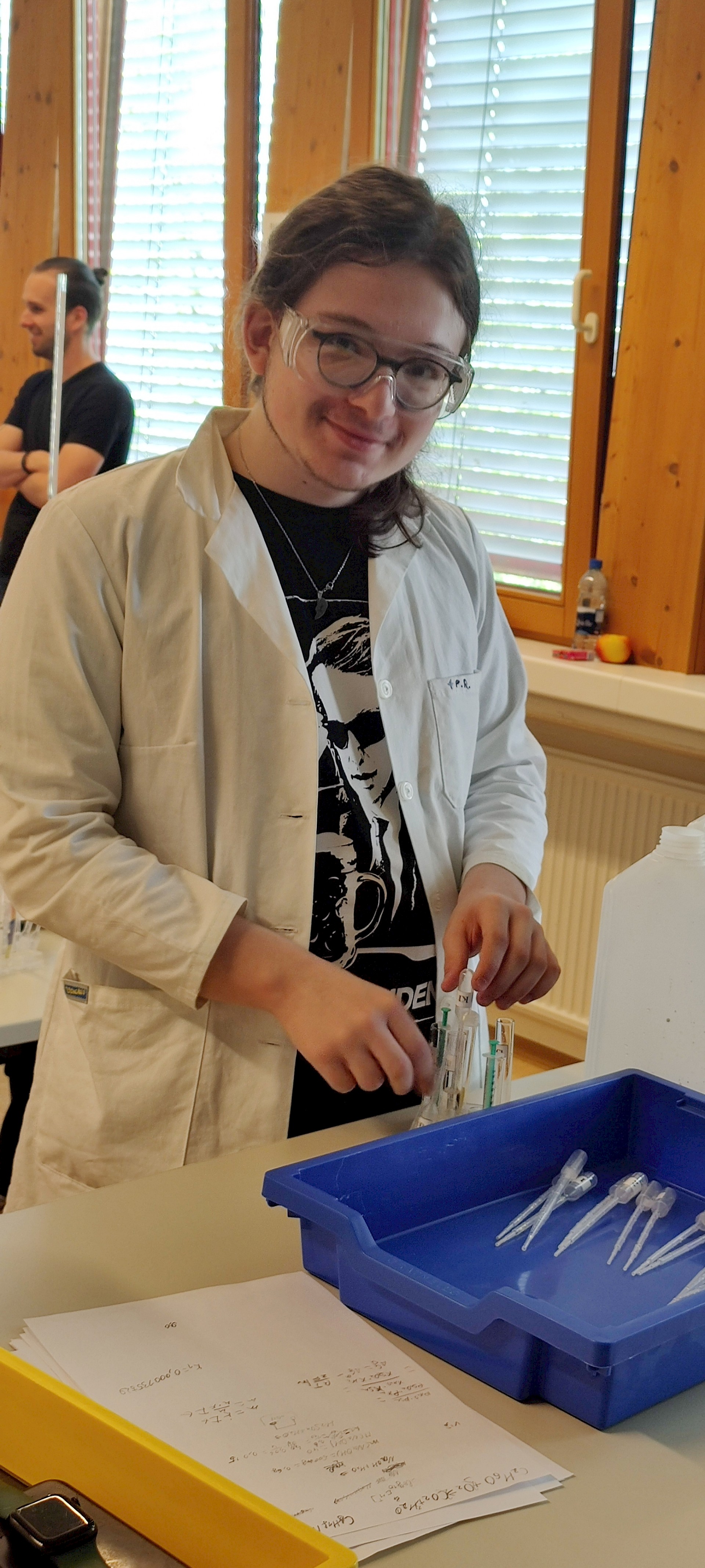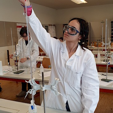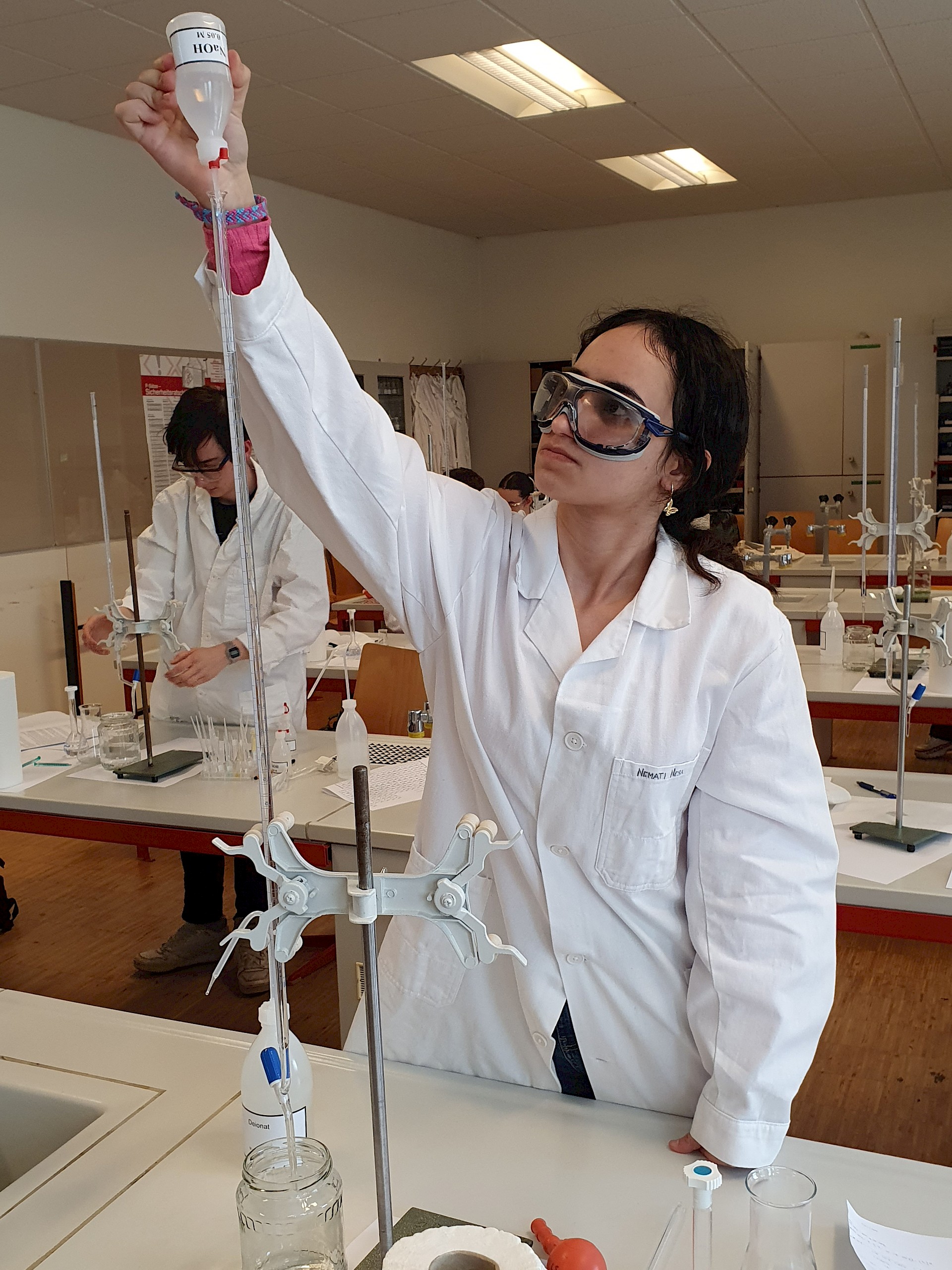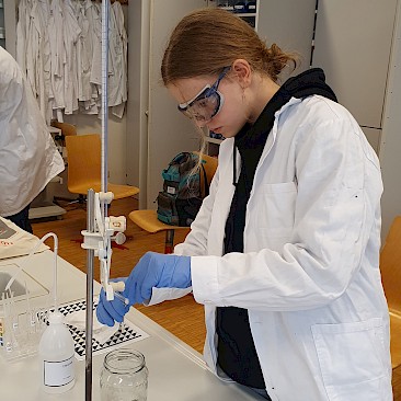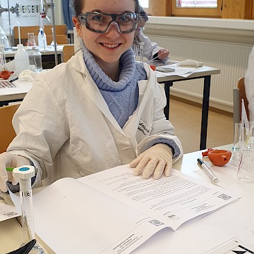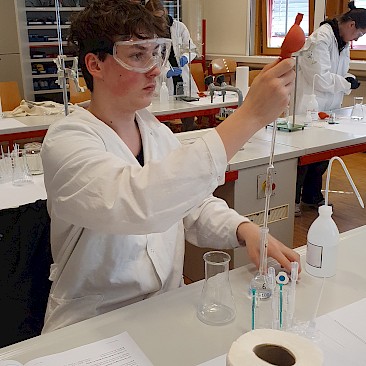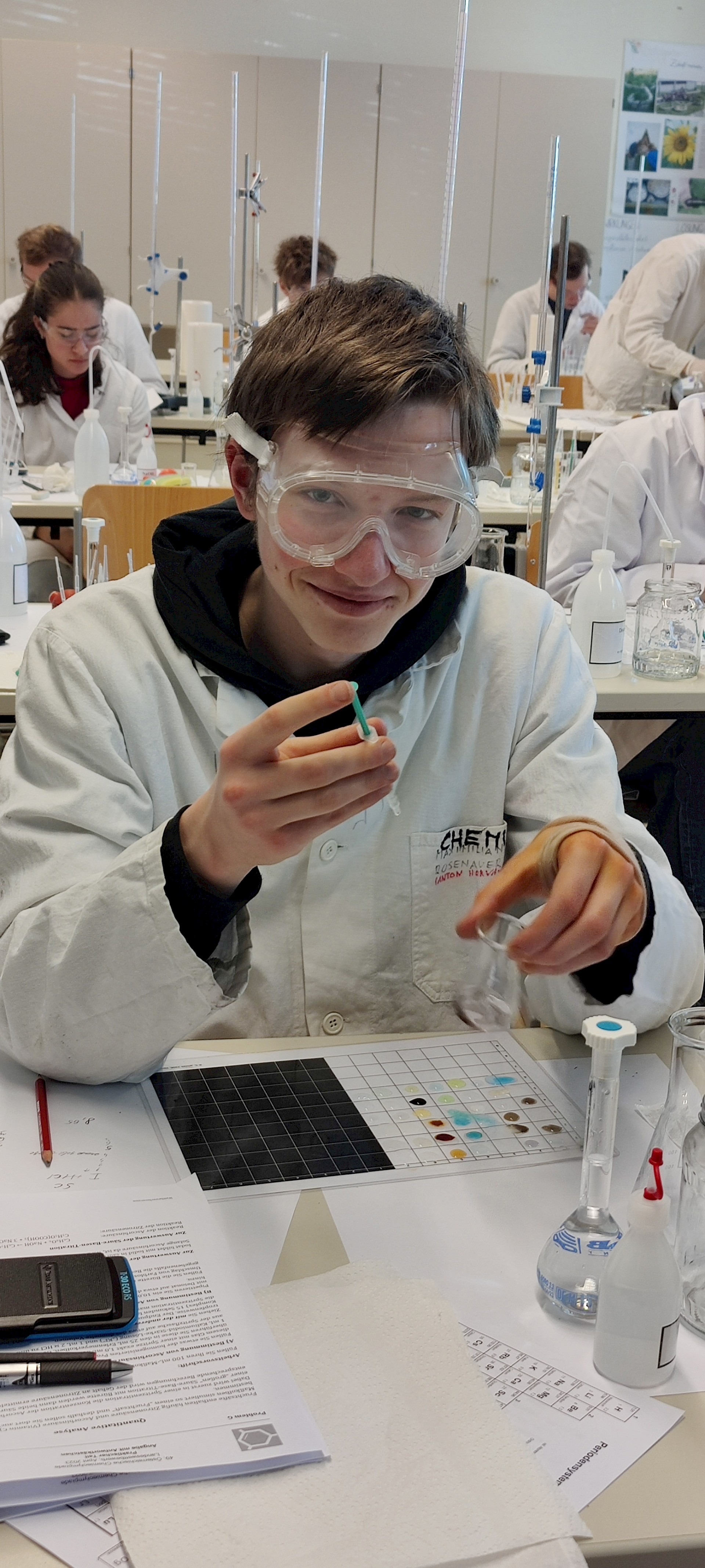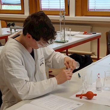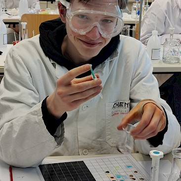 Die auserwählen 48 von über 200 Schüler*innen aus ganz Oberösterreich stellten sich dort einem theoretischen und einem praktischen Wettbewerb. Fragen aus der allgemeinen Chemie, der anorganischen Chemie, physikalischen Chemie, Spektroskopie und Strukturaufklärung und der organischen Synthesechemie wurden in Form einer dreistündigen Klausur theoretisch „serviert“. Die Praktiker kamen dann beim Ionentüpfeln und bei Titrationen auf ihre Rechnung (2,5 Stunden).
