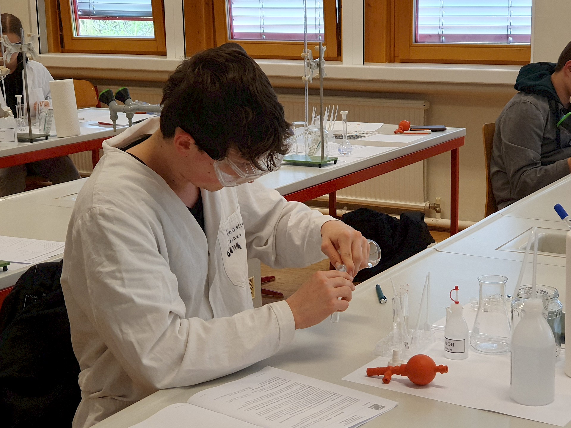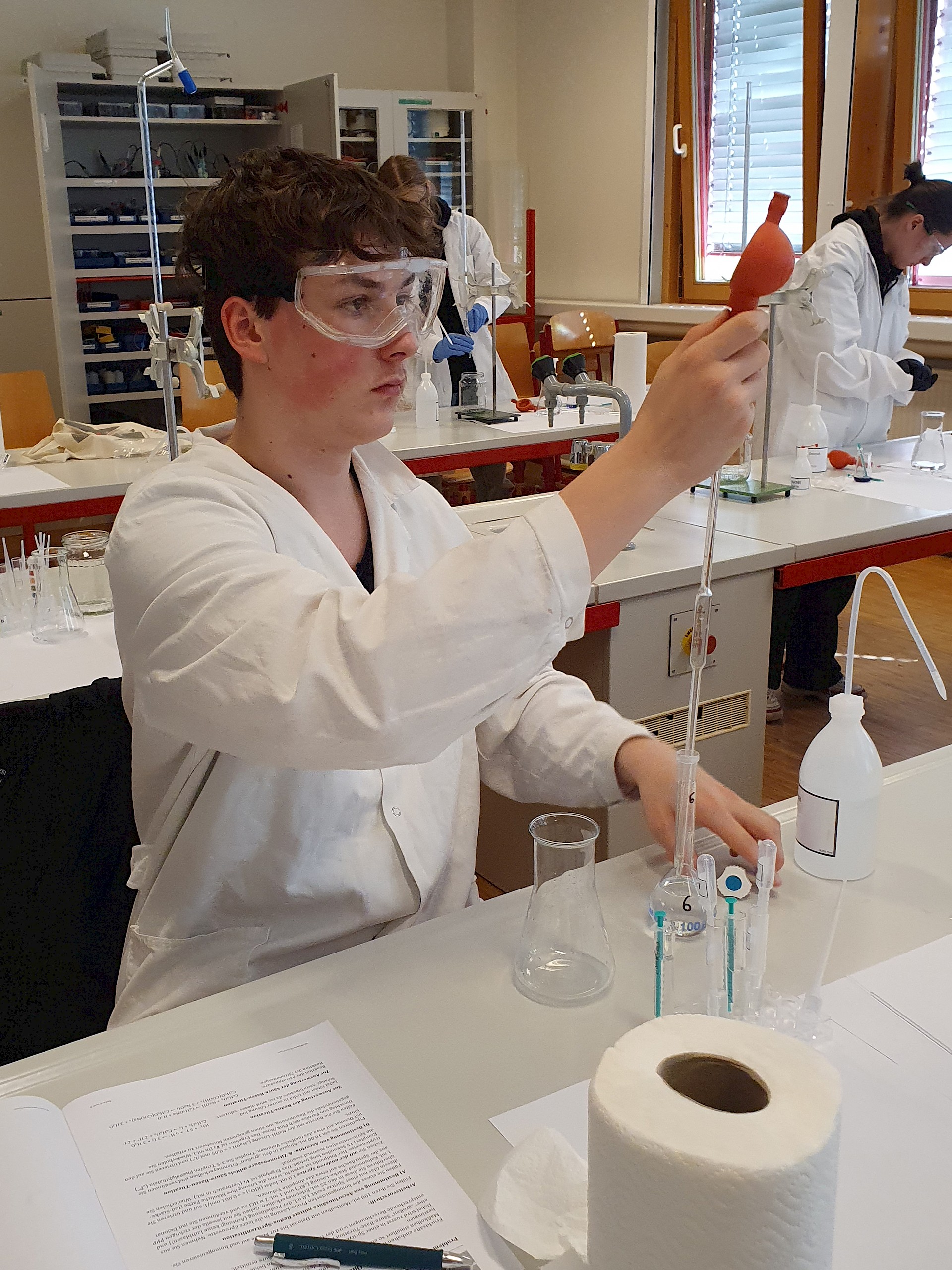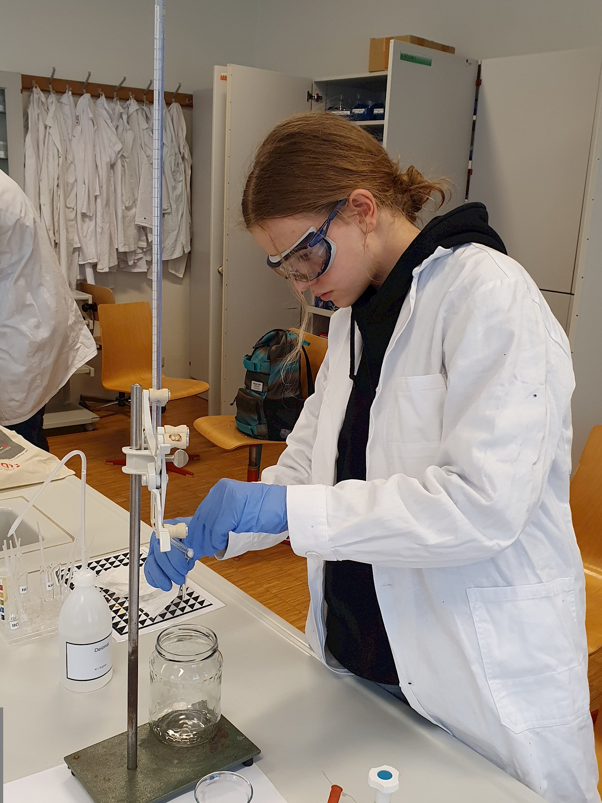 Die auserwählen 48 von über 200 Schüler*innen aus ganz Oberösterreich stellten sich dort einem theoretischen und einem praktischen Wettbewerb. Fragen aus der allgemeinen Chemie, der anorganischen Chemie, physikalischen Chemie, Spektroskopie und Strukturaufklärung und der organischen Synthesechemie wurden in Form einer dreistündigen Klausur theoretisch „serviert“. Die Praktiker kamen dann beim Ionentüpfeln und bei Titrationen auf ihre Rechnung (2,5 Stunden).