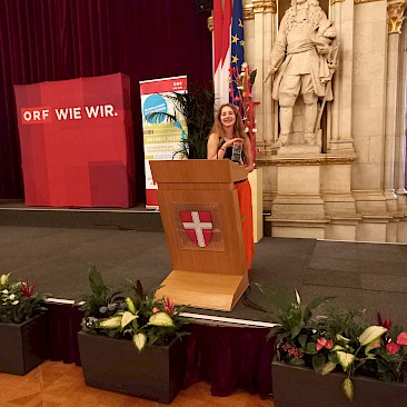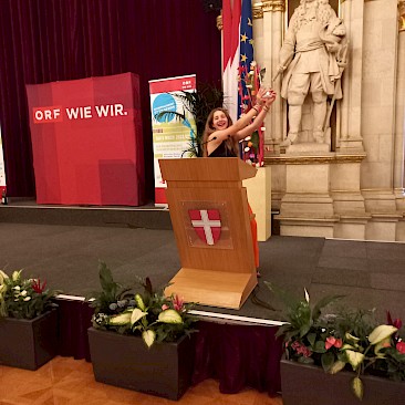 Pünktlich um 10:45 Uhr eröffnete Peter Wesely die Veranstaltung mit einer Videobotschaft unseres Herrn Bundespräsidenten Dr. Alexander van der Bellen. Ab 11 Uhr übertrug der ORF die Veranstaltung, die von der armenisch-türkischen Österreicherin Ani Gülgün-Mayr moderiert wurde, im TVthek-Livestream. Nachdem die Ehrengäste aus Politik und Wirtschaft ihre Statements abgegeben hatten, wurde es spannend: Die jeweils zehn besten Reden jeder Kategorie (Kategorie I: 7.-8. Schulstufe / Kategorie II: 9.-10. Schulstufe / Kategorie III: 11.-13. Schulstufe) wurden prämiert. Vorgestellt wurden die Preisträger*innen durch erfolgreiche ehemalige Wettbewerbs-Teilnehmer*innen. Dazwischen performte ein Alumni-Duo den Song „True Colors“ und bat dazu alle Finalistinnen und Finalisten auf die Bühne. Zentrale Aussage: Sei wie du bist – „true colors are beautiful like a rainbow.“