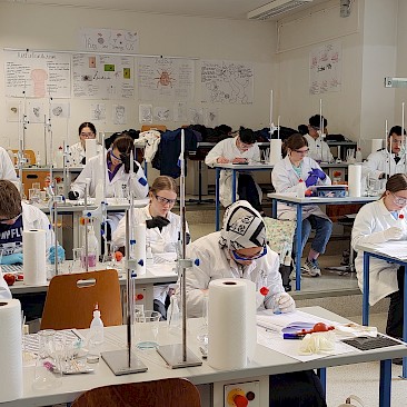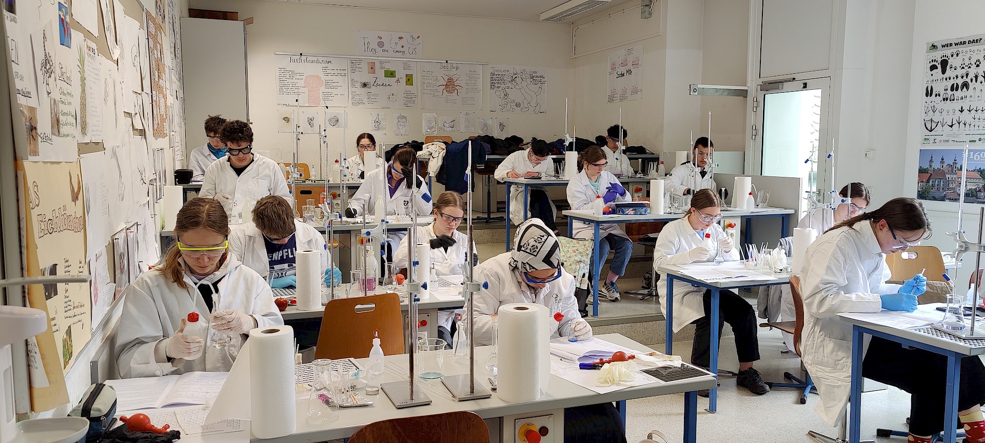 Dieses Training mündete dann in einen bis zu 5 stündigen Kurswettbewerb am Freitag vor den Osterferien um die Besten Brucknergym Schüler*innen für den Landeswettbewerb zu finden. Heuer waren das 21 SuS, die sich im Kurswettbewerb gemessen haben. Alle bekamen als Dankeschön ein eigenes Brucknergym Cheoly Leiberl, eine Urkunde und einen von der Chemieolympiade bezahlten Workshop an der JKU (dem Verbrecher auf der Spur - CSI), den wir dann gemeinsam am 21.6. besuchten.