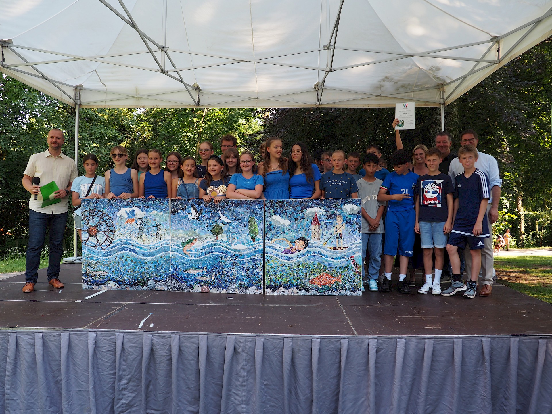 Am 27.6.2024 war es dann endlich soweit und wir konnten für unsere heurige Projekteinreichung den tollen 2. Platz gewinnen. Bei einer kleinen, feinen Feier im Welser Tiergarten durfte sich die 2E nicht nur über kleine, persönliche Aufmerksamkeiten freuen, sondern auch einen Scheck in Wert von 400€ für den Schulgarten in Empfang nehmen. Für unsere wunderbare Reißcollage ernteten wir besonderes Lob. Viele Besucher*innen blieben stehen, um sie genauer in Augenschein nehmen zu können. Für alle interessierten Schüler*innen und Eltern wird die Reißcollage am Schulgartengang in unserer Schule einen dauerhaften Ausstellungsplatz erhalten.