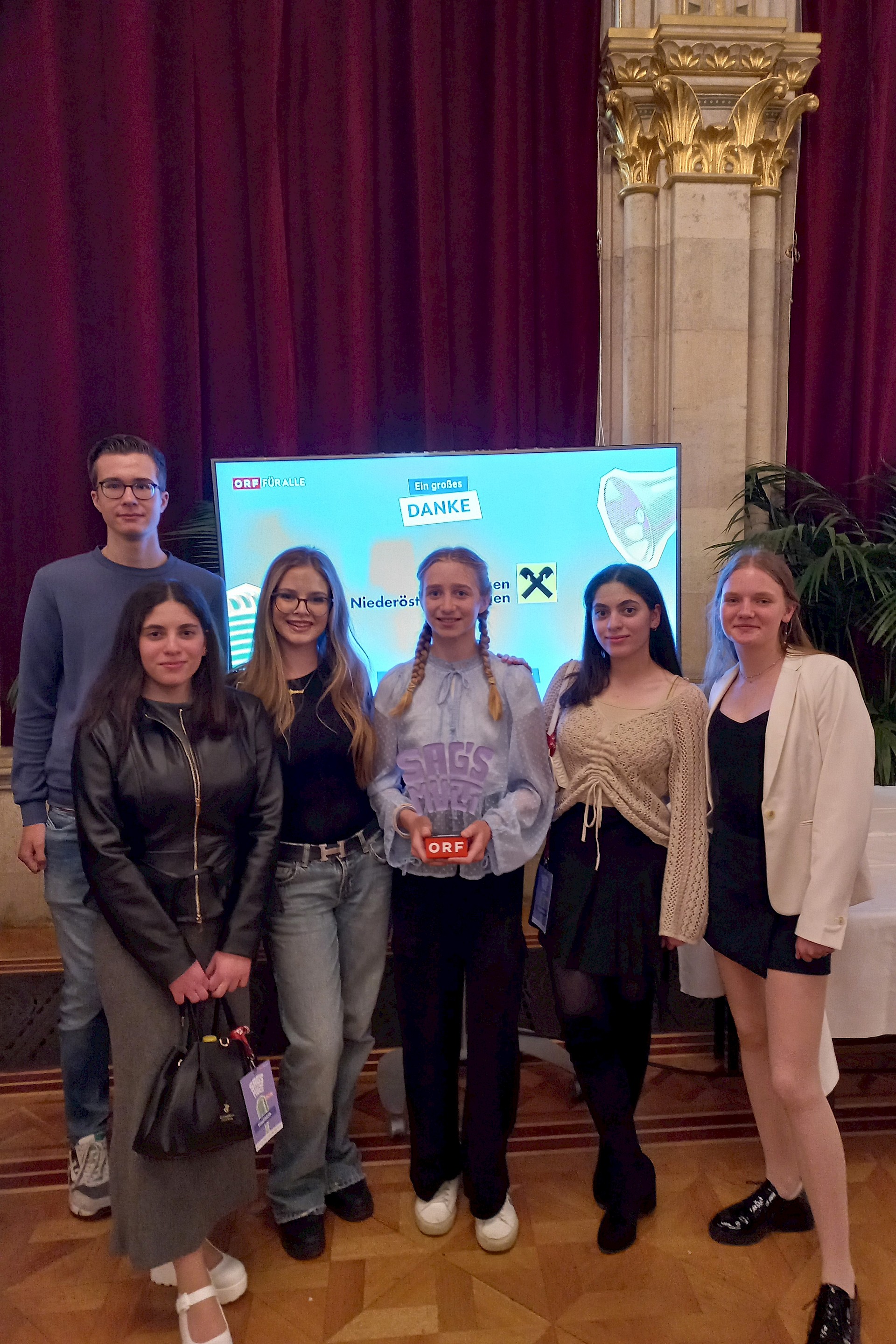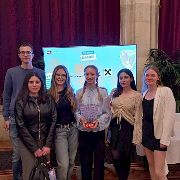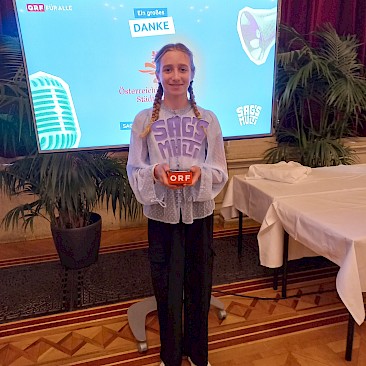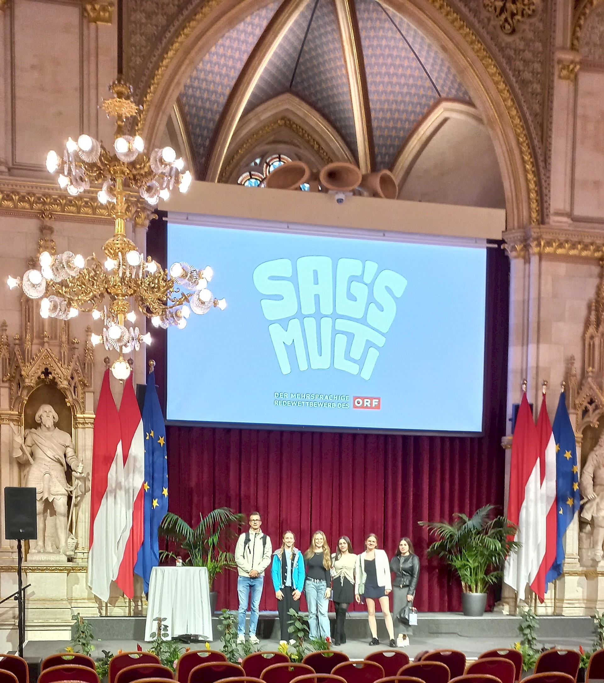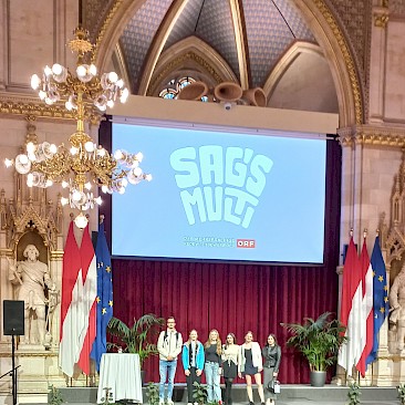 Am 16. Mai 2025 fand im prunkvollen Festsaal des Wiener Rathauses die Abschlussfeier statt. Unsere sieben Finalist*innen warteten gespannt auf die Verlautbarung der Ergebnisse. Pro Alterskategorie wurden österreichweit jeweils zehn Redner*innen prämiert, darunter unsere Theresa Luger (3A), die die internationale Jury mit ihrer mitreißenden Rede auf Englisch und Deutsch zum Thema „Ohne Menschenrechte keine Gerechtigkeit" überzeugte.