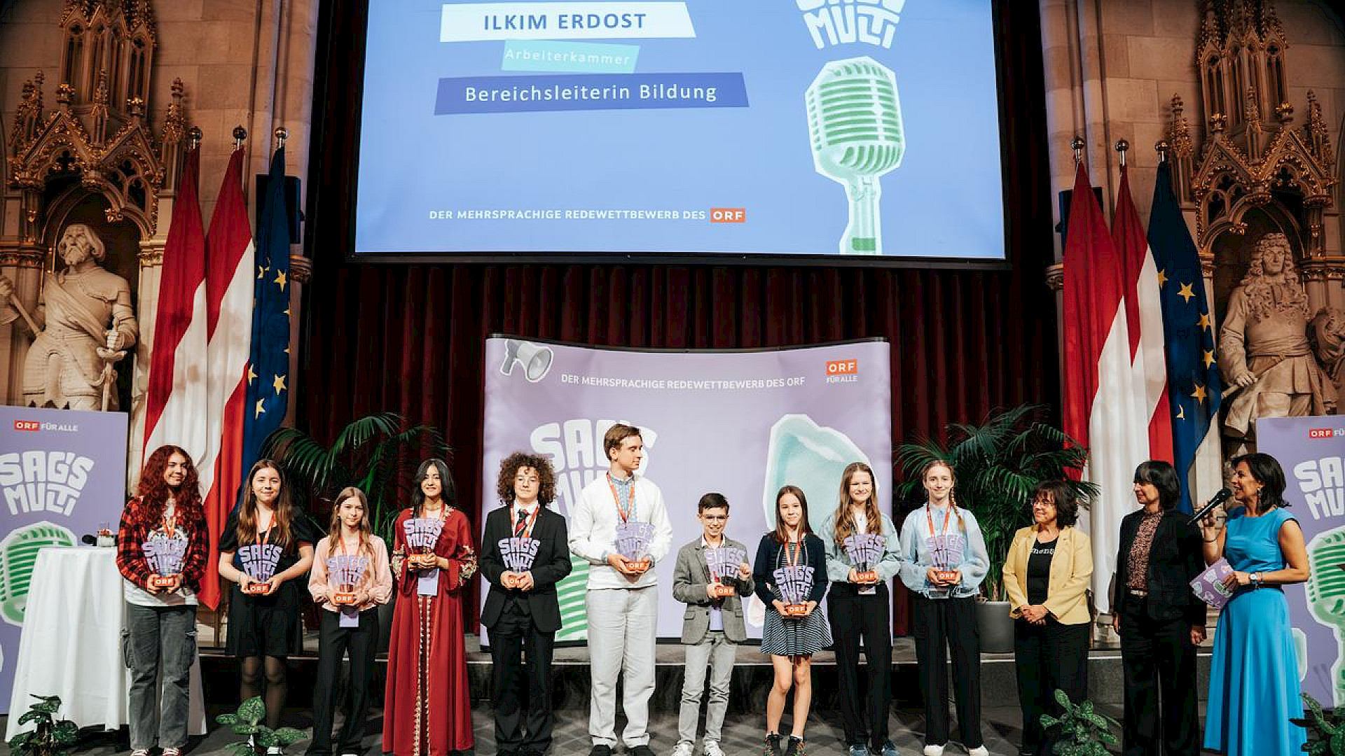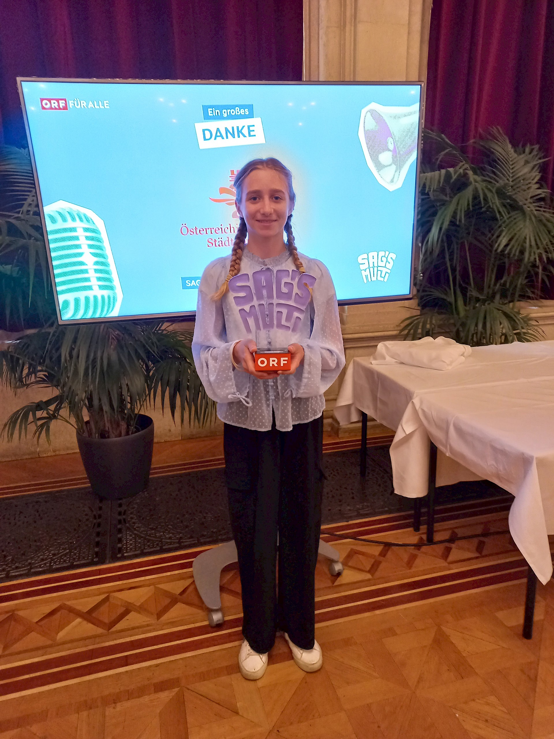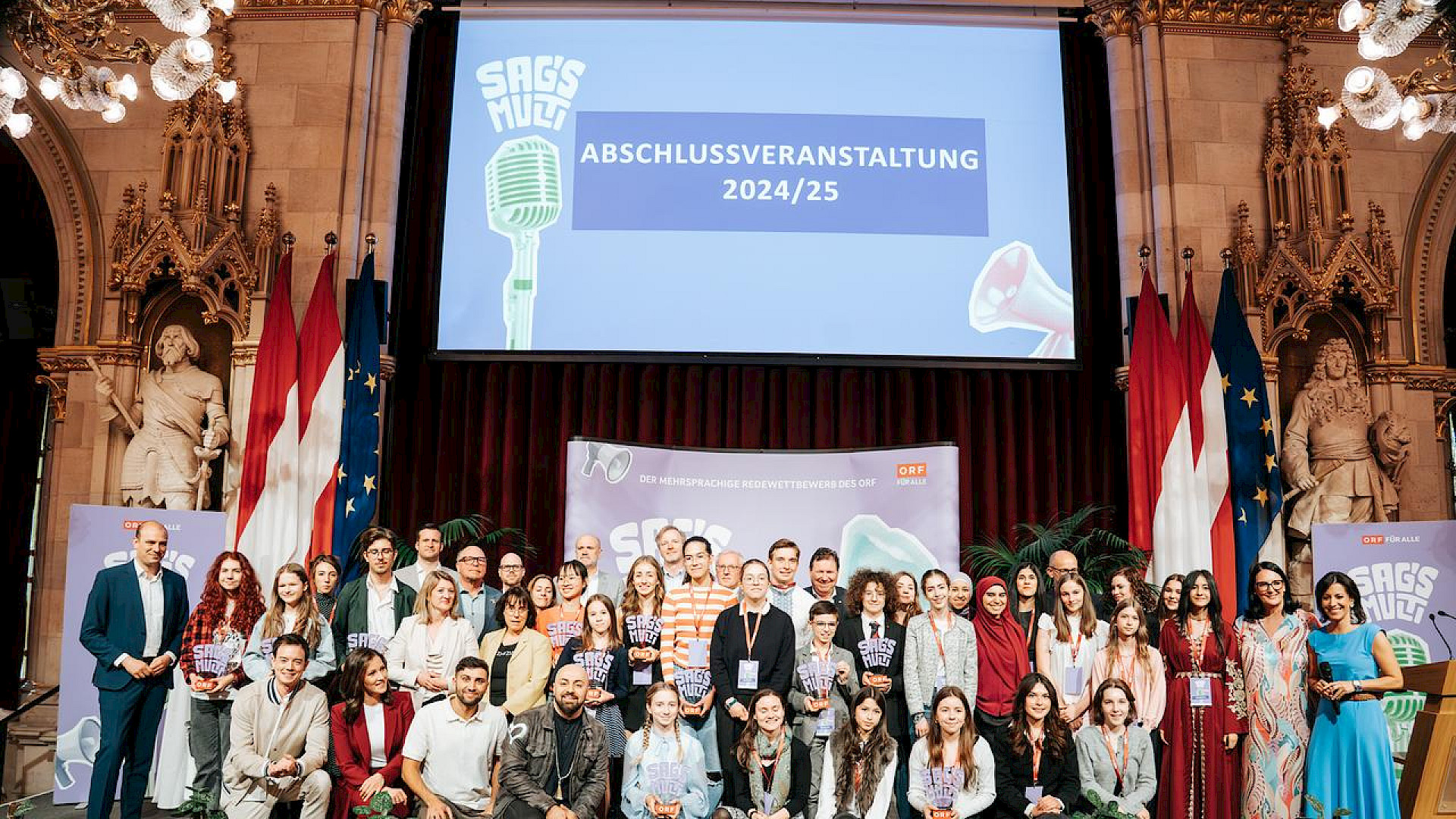 Am 16. Mai 2025 fand im prunkvollen Festsaal des Wiener Rathauses die Abschlussfeier statt. Unsere sieben Finalist*innen warteten gespannt auf die Verlautbarung der Ergebnisse. Pro Alterskategorie wurden österreichweit jeweils zehn Redner*innen prämiert, darunter unsere Theresa Luger (3A), die die internationale Jury mit ihrer mitreißenden Rede auf Englisch und Deutsch zum Thema „Ohne Menschenrechte keine Gerechtigkeit" überzeugte.